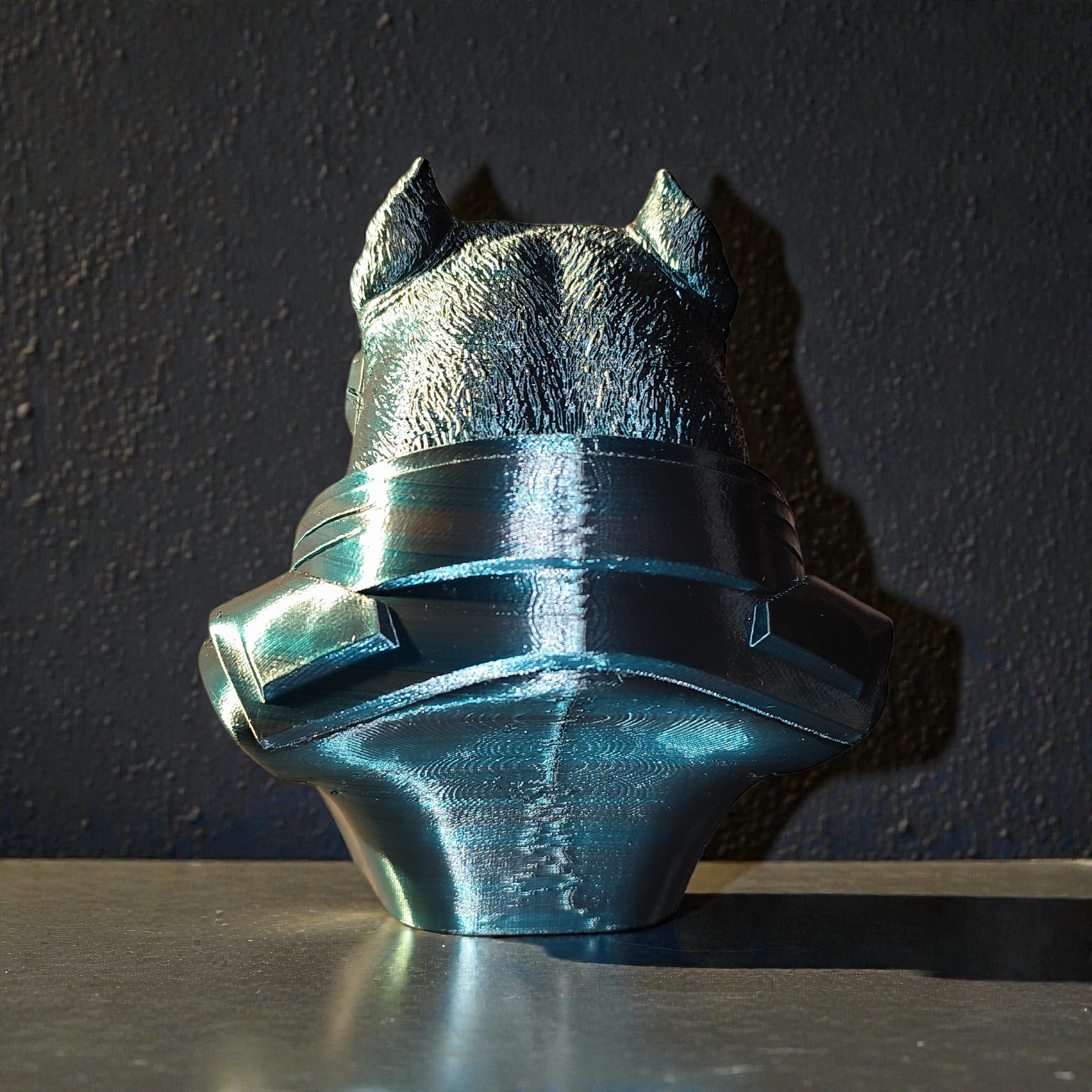Gefertigt im 3D-Druckverfahren entsteht eine detailreiche Oberfläche mit sichtbarer Struktur – ein bewusstes Merkmal moderner additiver Fertigung und Teil des industriellen Looks. Die Verschmelzung von tierischer Stärke und mechanischer Präzision macht diese Büste zu einem echten Hingucker.