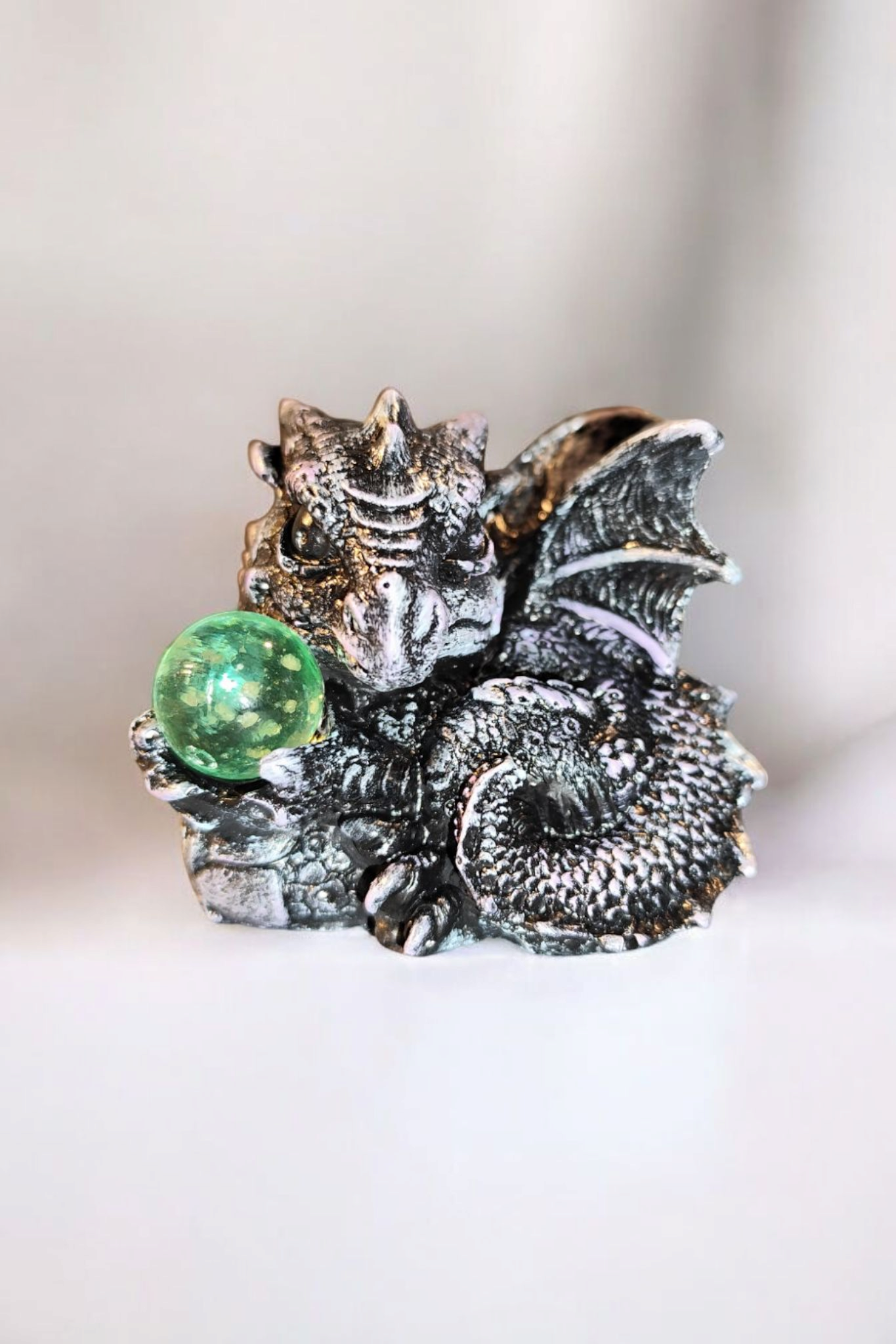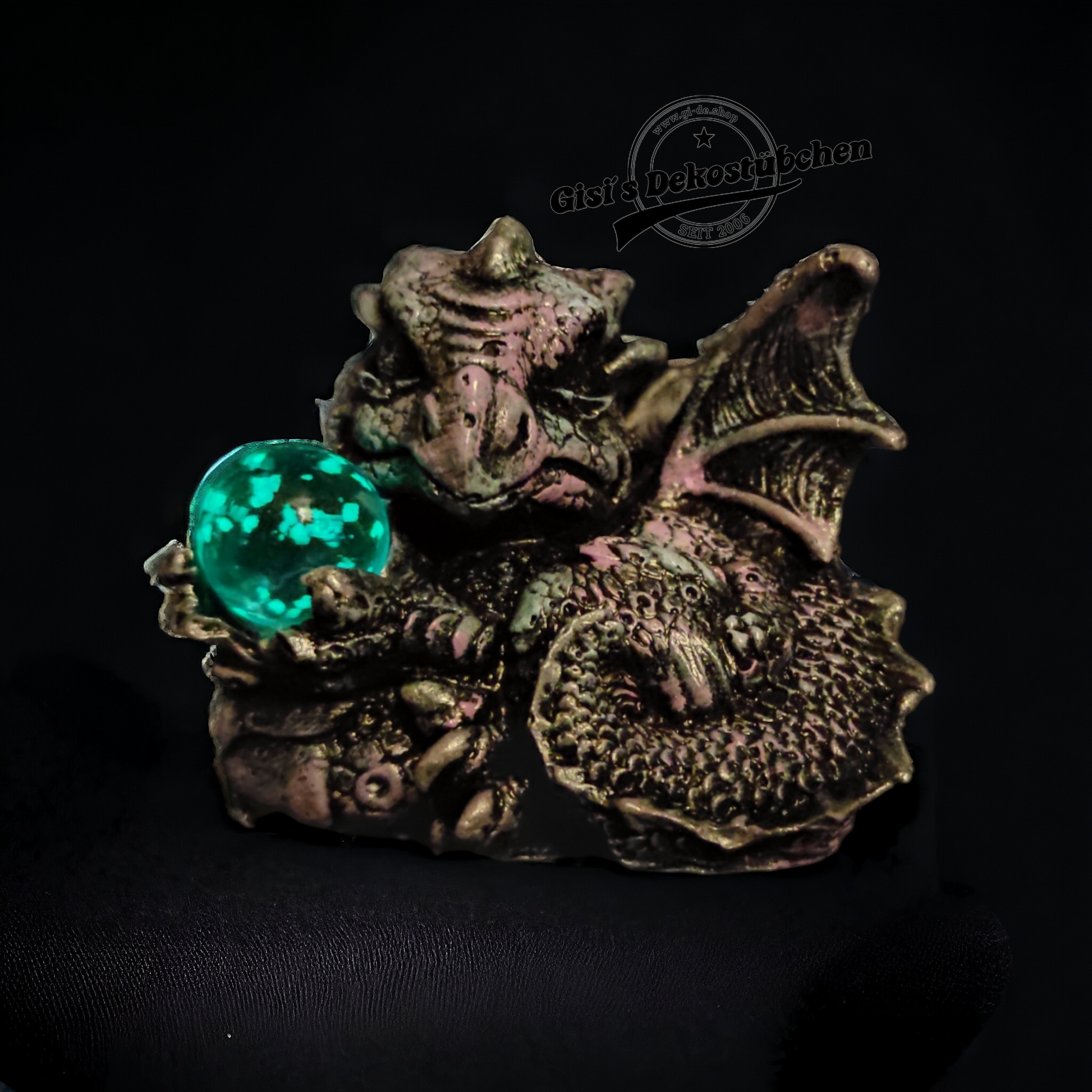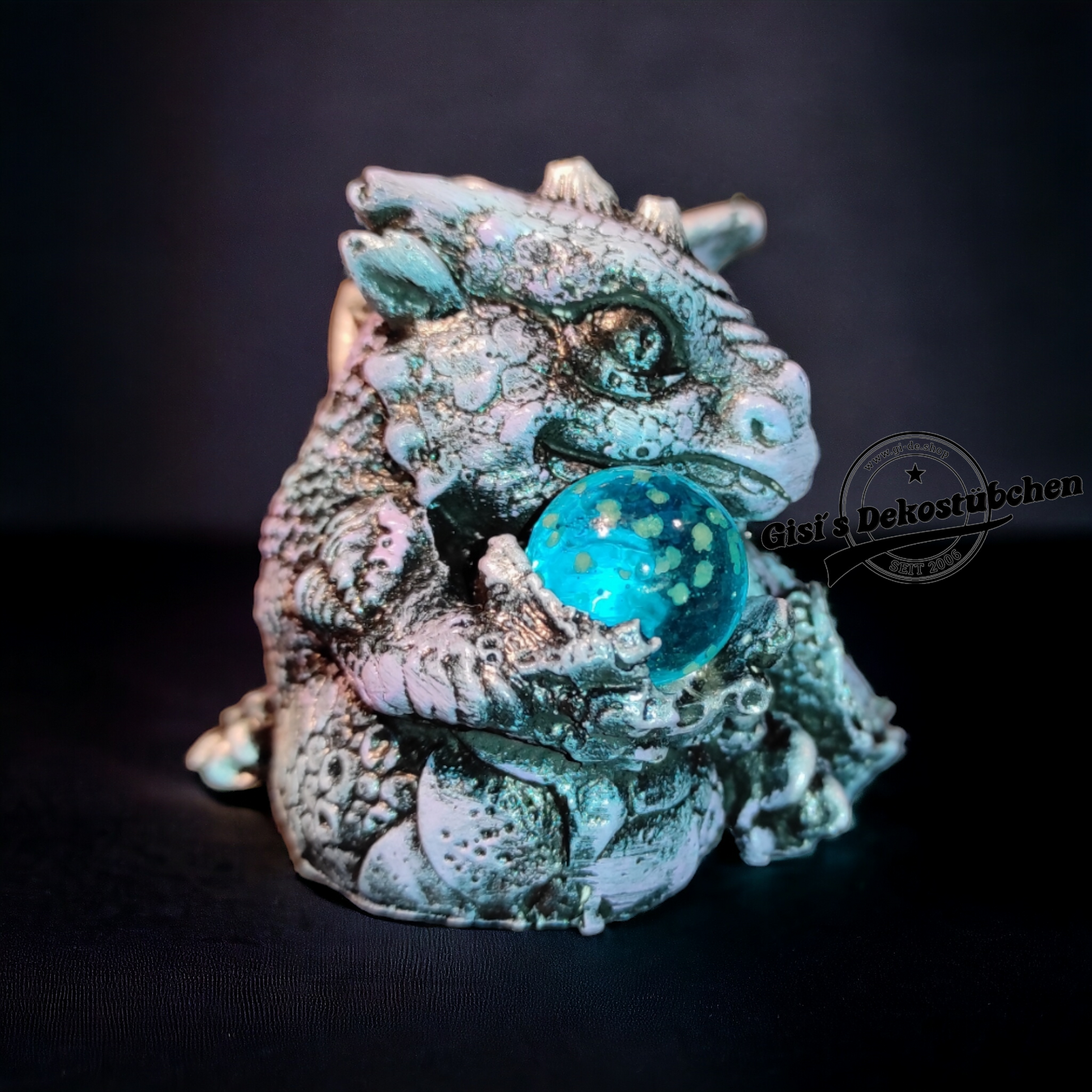 Entdecken Sie diese bezaubernde handbemalte Drachenfigur, die mit ihrer magisch leuchtenden Glaskugel jeden Raum in ein mystisches Licht taucht. Jeder Drache ist ein liebevoll gestaltetes Unikat und wird mit größter Sorgfalt von Hand bemalt.