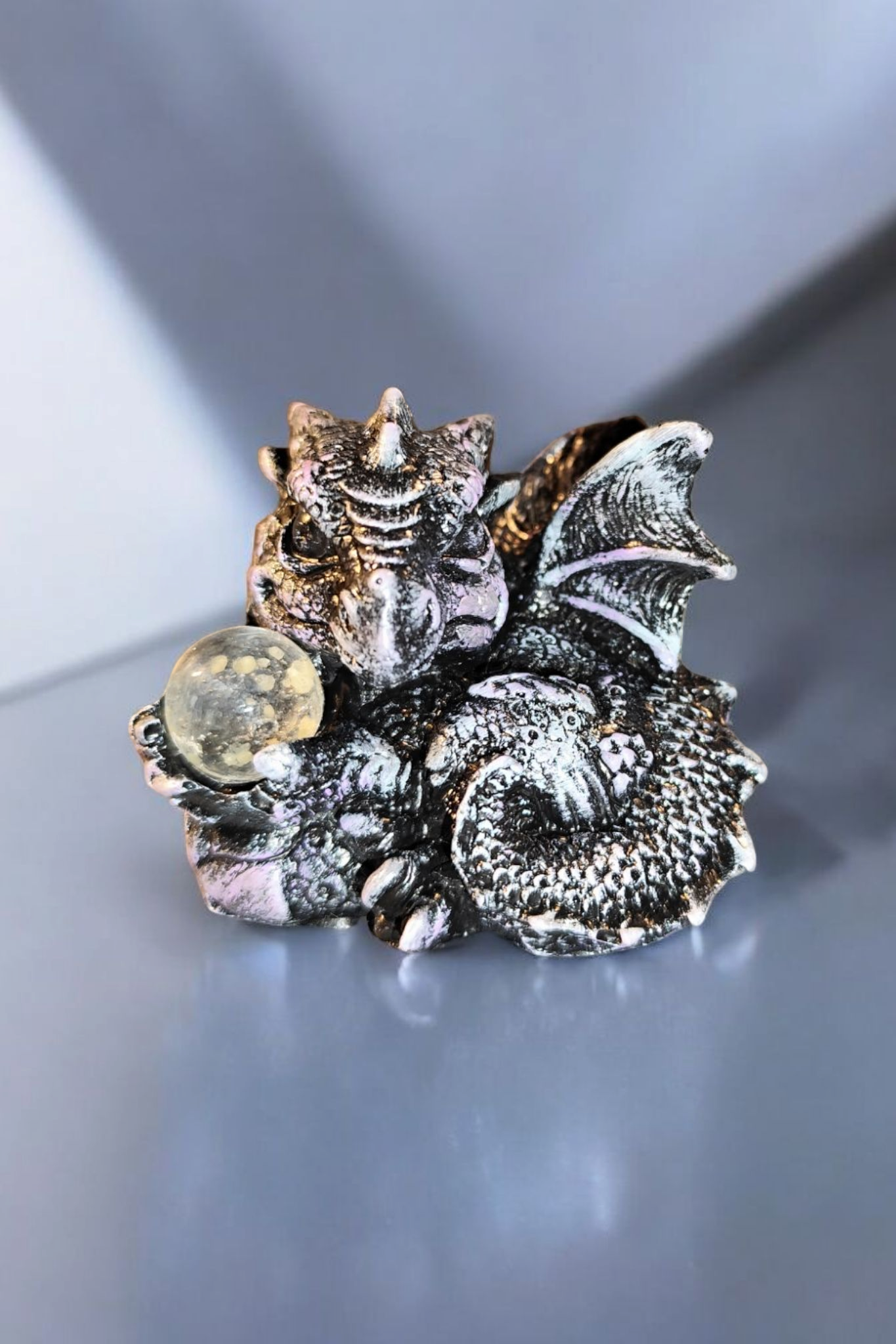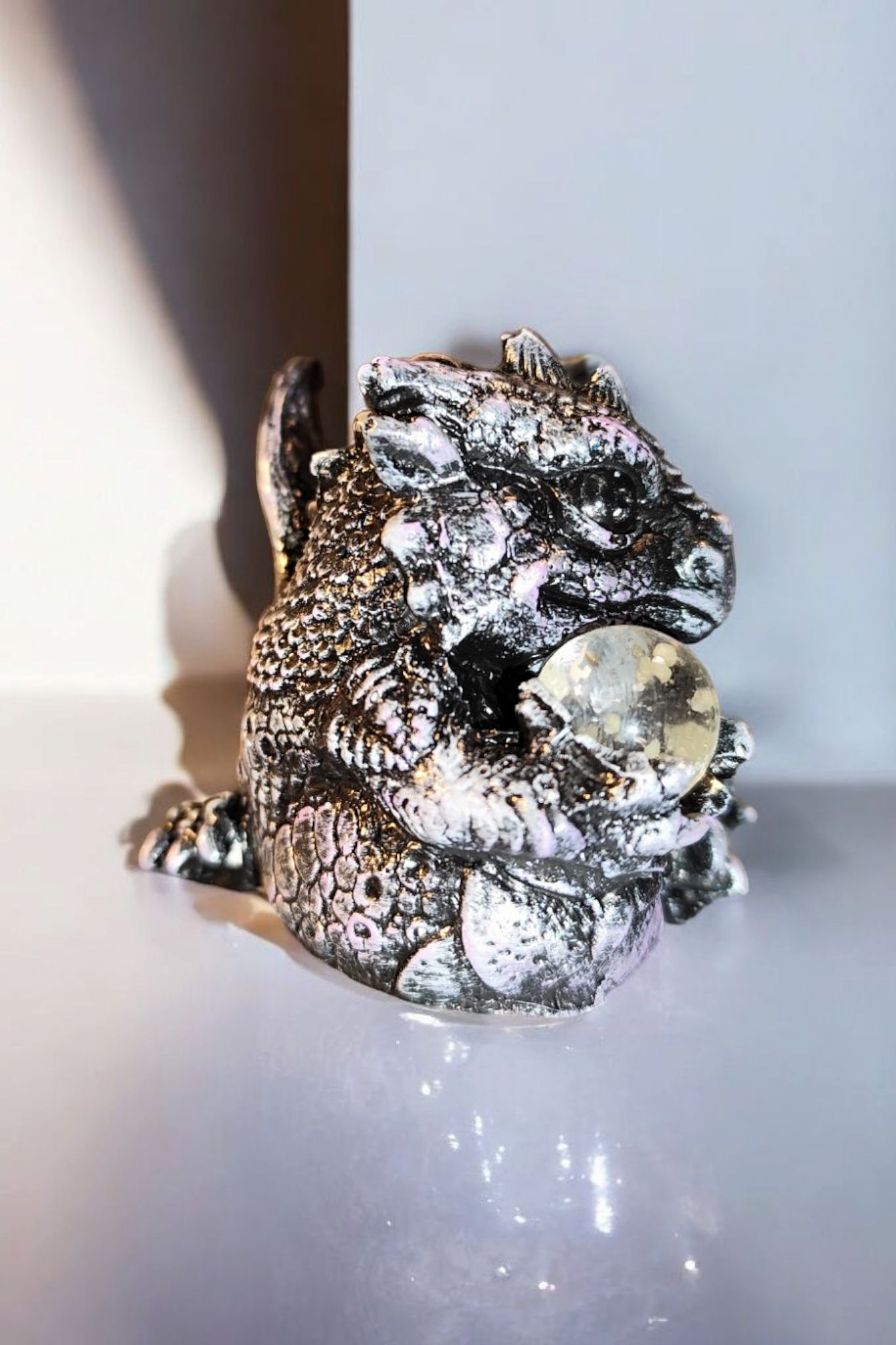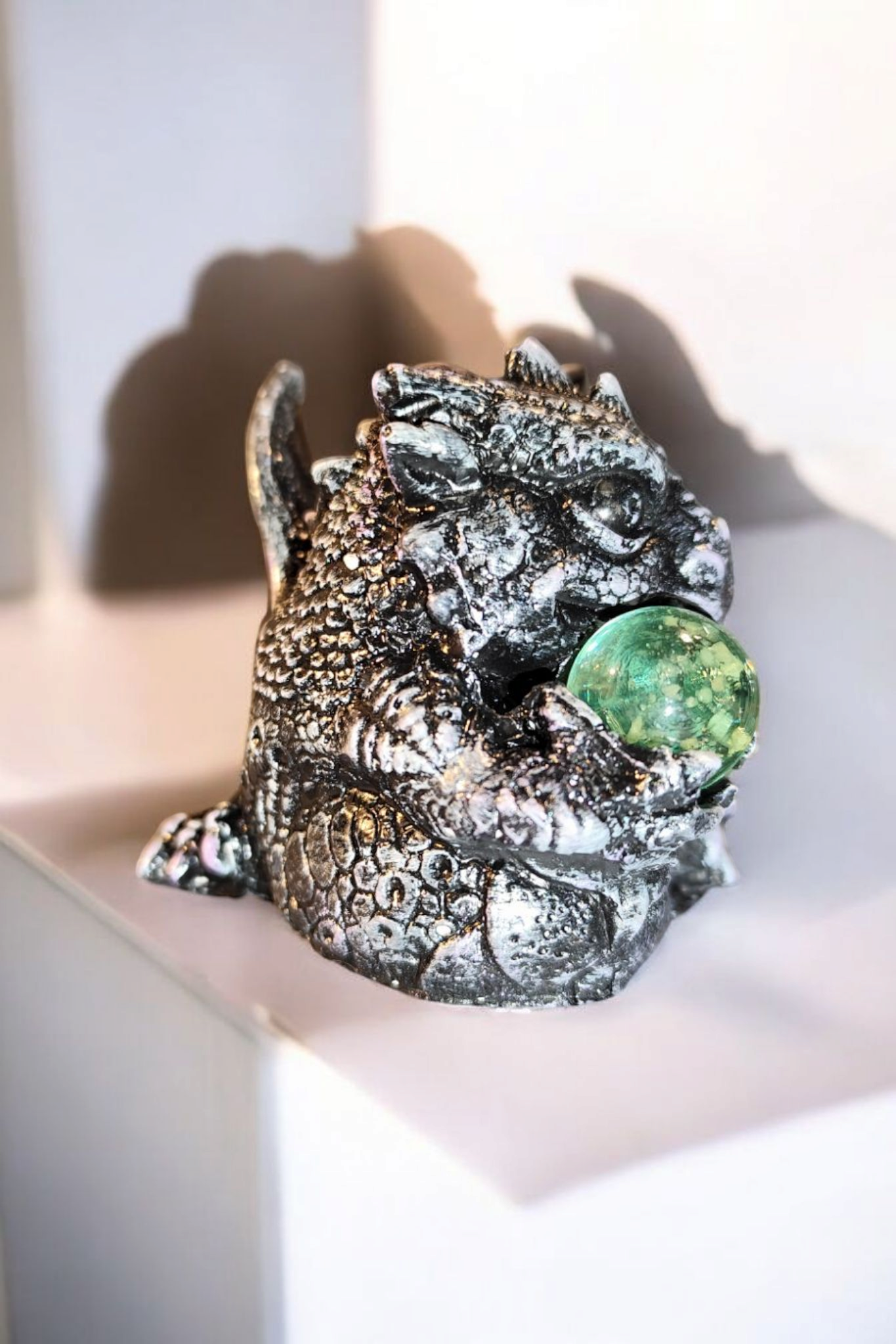 Entdecken Sie diese bezaubernde handbemalte Drachenfigur, die mit ihrer magisch leuchtenden Glaskugel jeden Raum in ein mystisches Licht taucht. Jeder Drache ist ein liebevoll gestaltetes Unikat und wird mit größter Sorgfalt von Hand bemalt.
