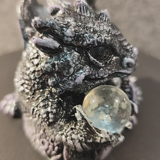 Drachen Statue "Der Wächter des Lichts" - Handbemalte Keramikfigur mit leuchtender Glaskugel
