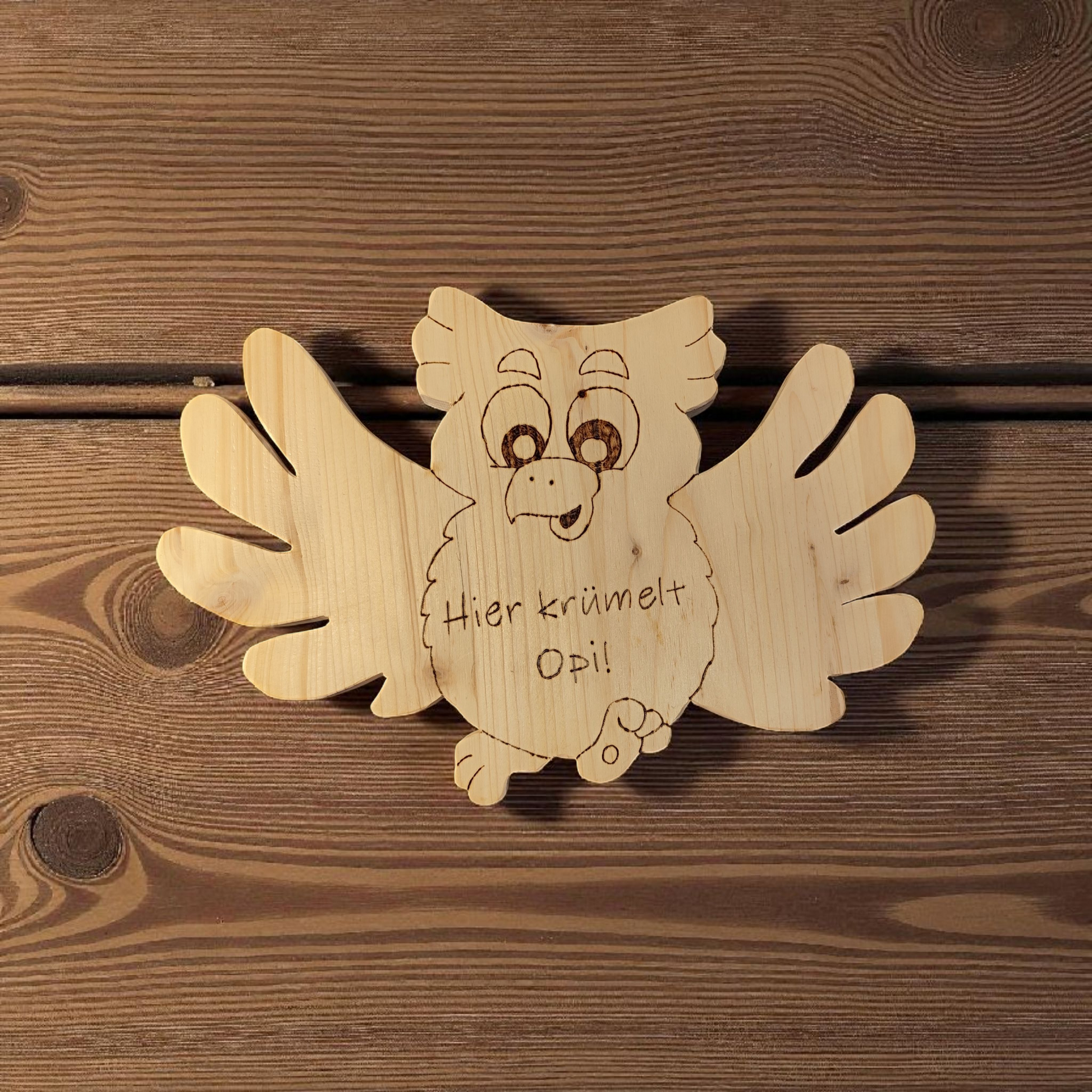 Holz gesägt, geschliffen, Brandmalerei, Handgezeichnet.
