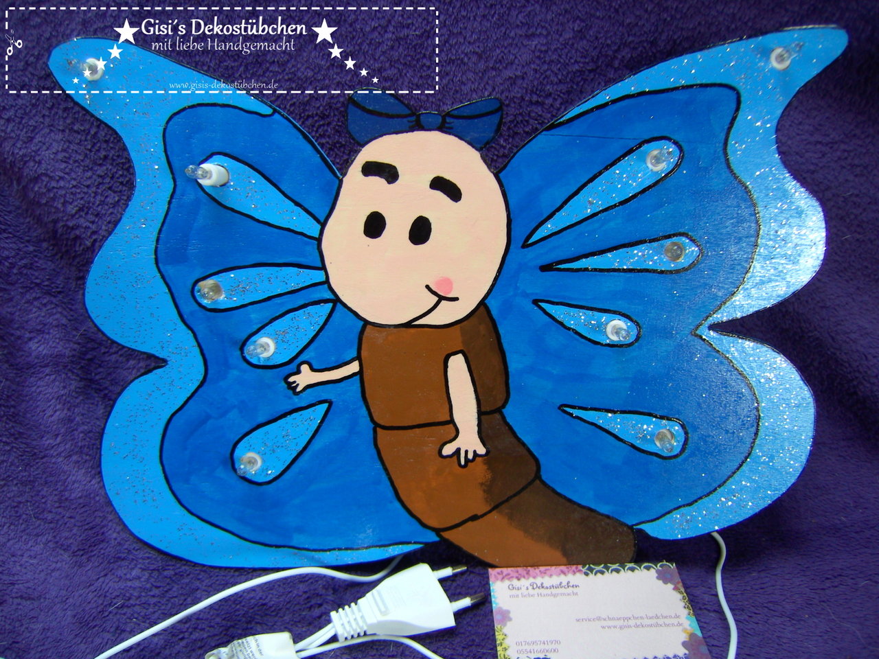 Gefällt Ihnen der Schmetterling als Motiv, möchten aber keine Lampe, kein Problem, ich kann Ihnen mit diesem Motiv auch ein Namensschild oder eine Geburtstafel anfertigen.