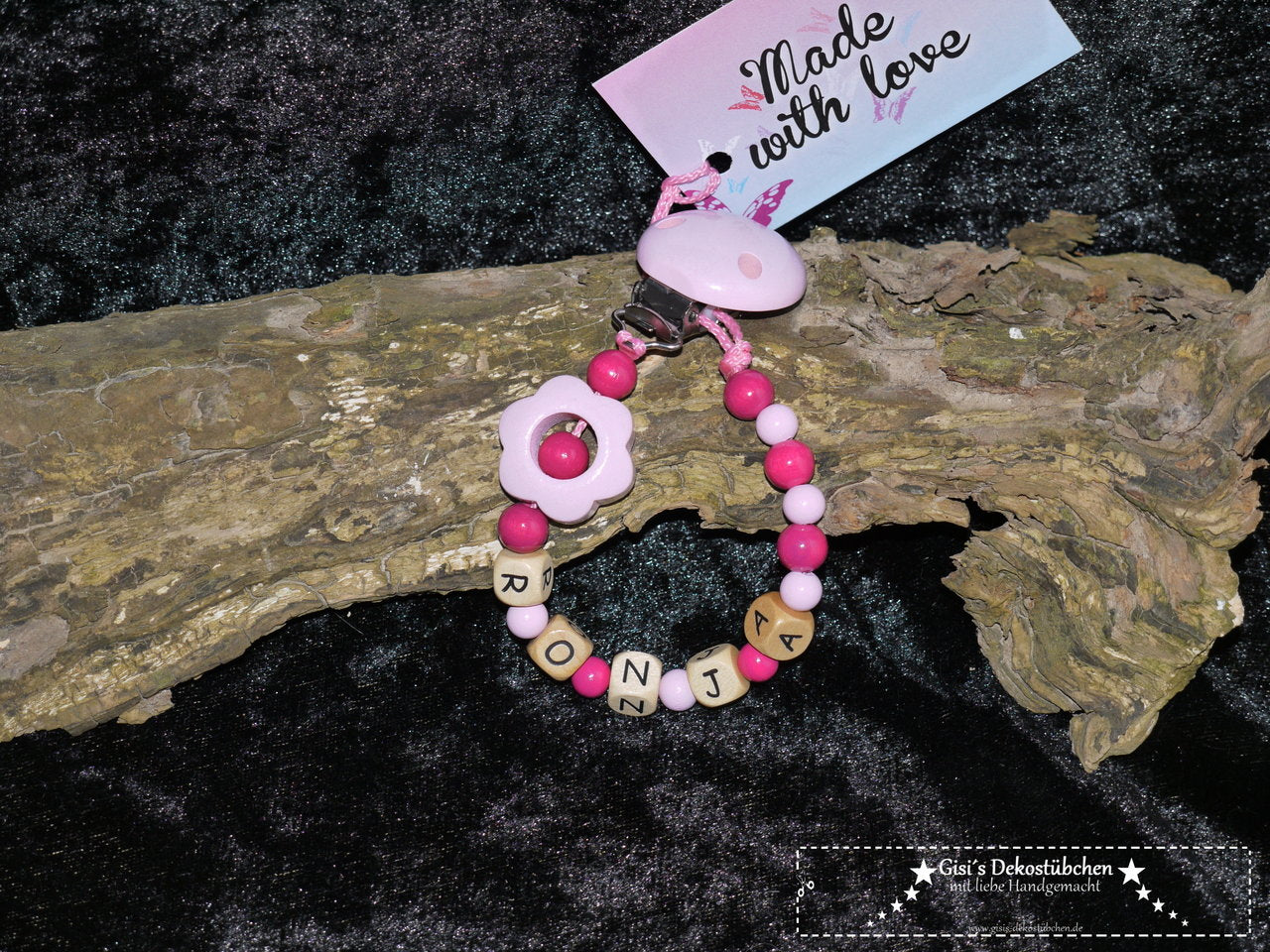 +Liebevoll gestaltete Schnullerketten mit dem Namen des Kindes. Hier wird der Name des Kindes mit Buchstabenwürfel in die Schnullerkette eingearbeitet. So lassen sich wunderbar Namen auf der Schnullerkette verewigen. Diese besondere Personalisierung macht die Schnullerketten einzigartig und ist zudem ein sehr schönes Geschenk zur Geburt, Taufe oder Geschenk zur Babyparty. Mit dem personalisierten Schnullerketten ist eine Verwechslung ausgeschlossen. Es ist auch ein praktischer Helfer für den Alltag und eine tolle Erinnerung für später.+