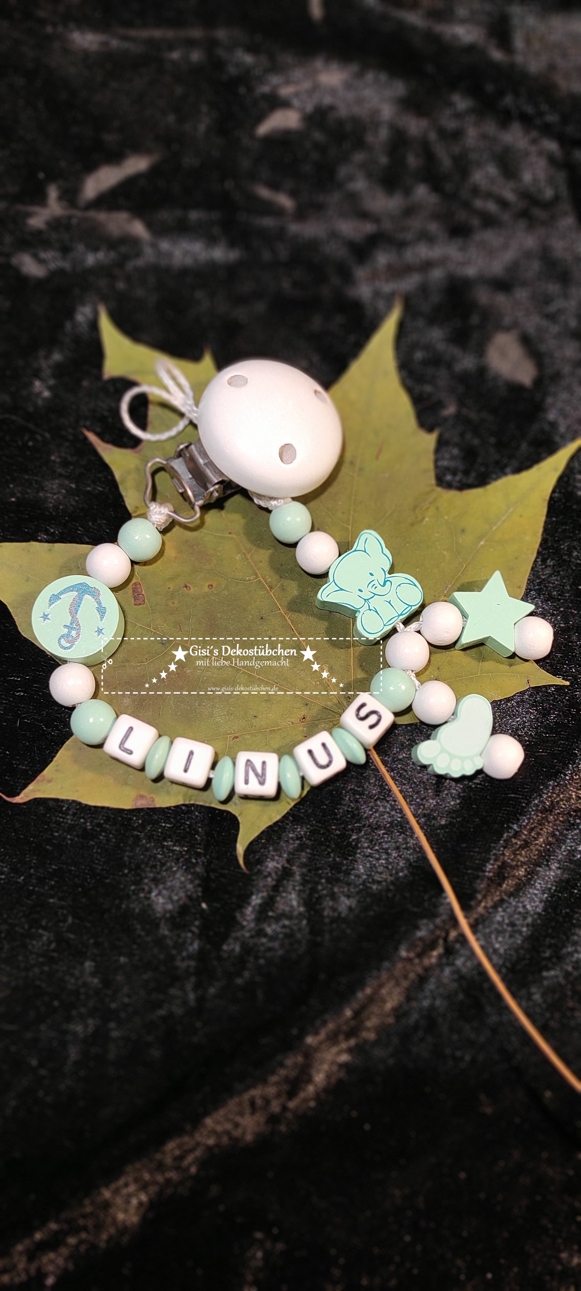 Schnullerkette mit Namen Elefant, Anker, Fuß und Stern