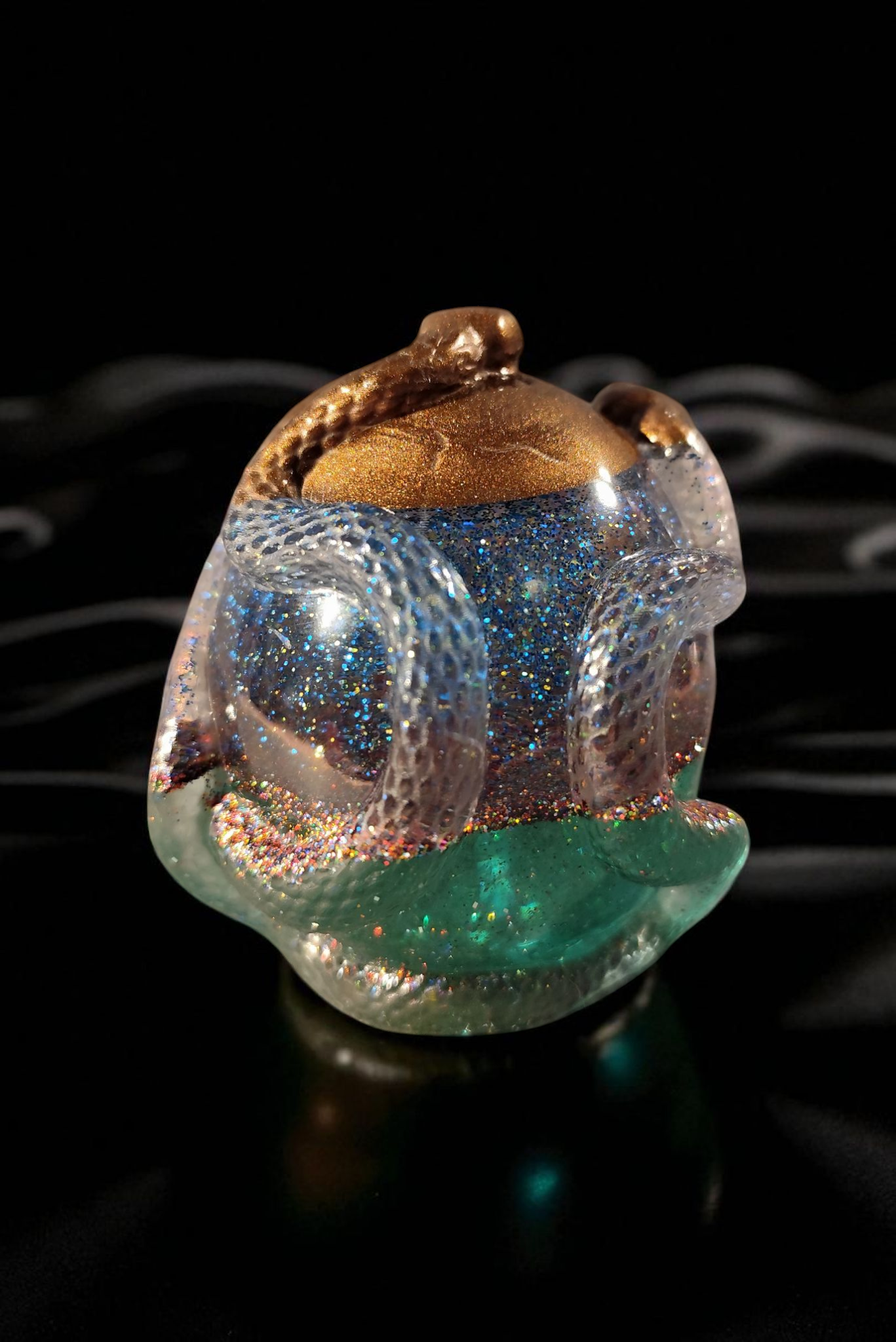 Dieses Einzelstück wurde von Hand gegossen, geschliffen und mit einer Mischung aus schillernden Pigmenten und unheilvollem Glitzer versehen.