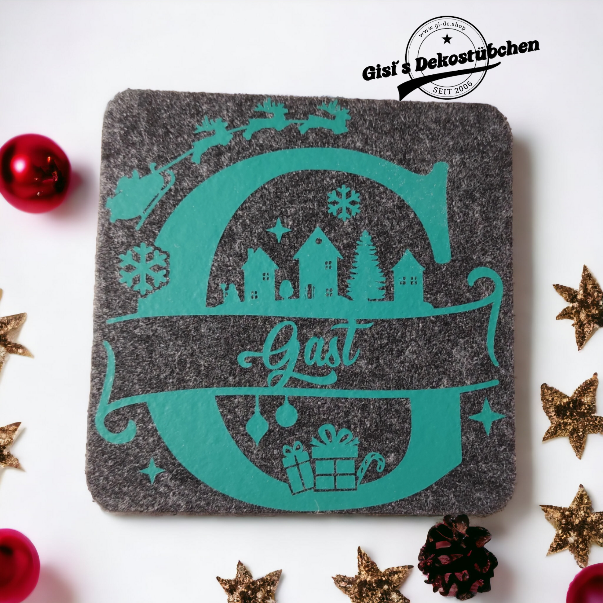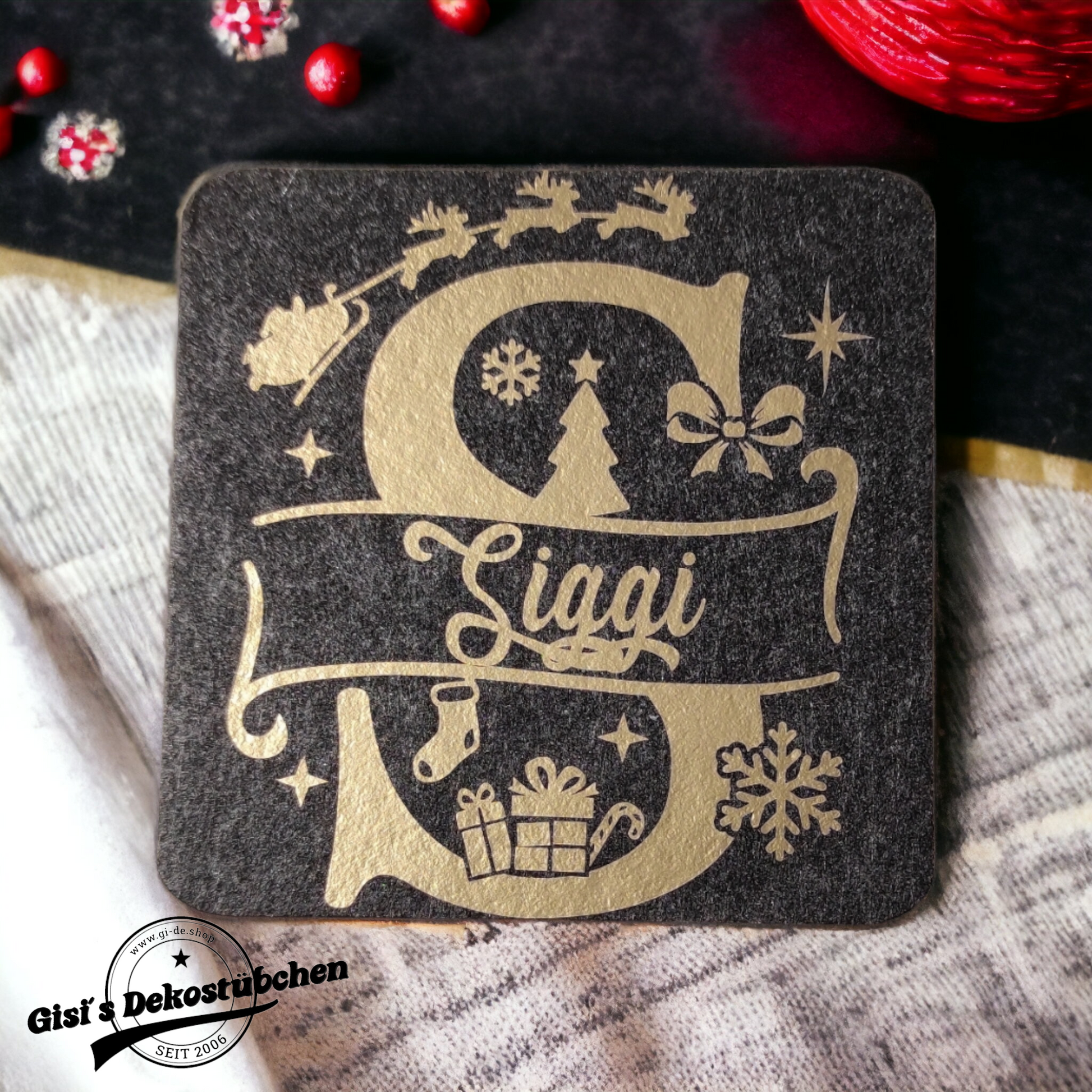 Filz Untersetzer mit Weihnachtlichen Motiv und Namen.